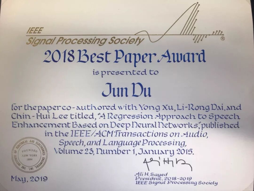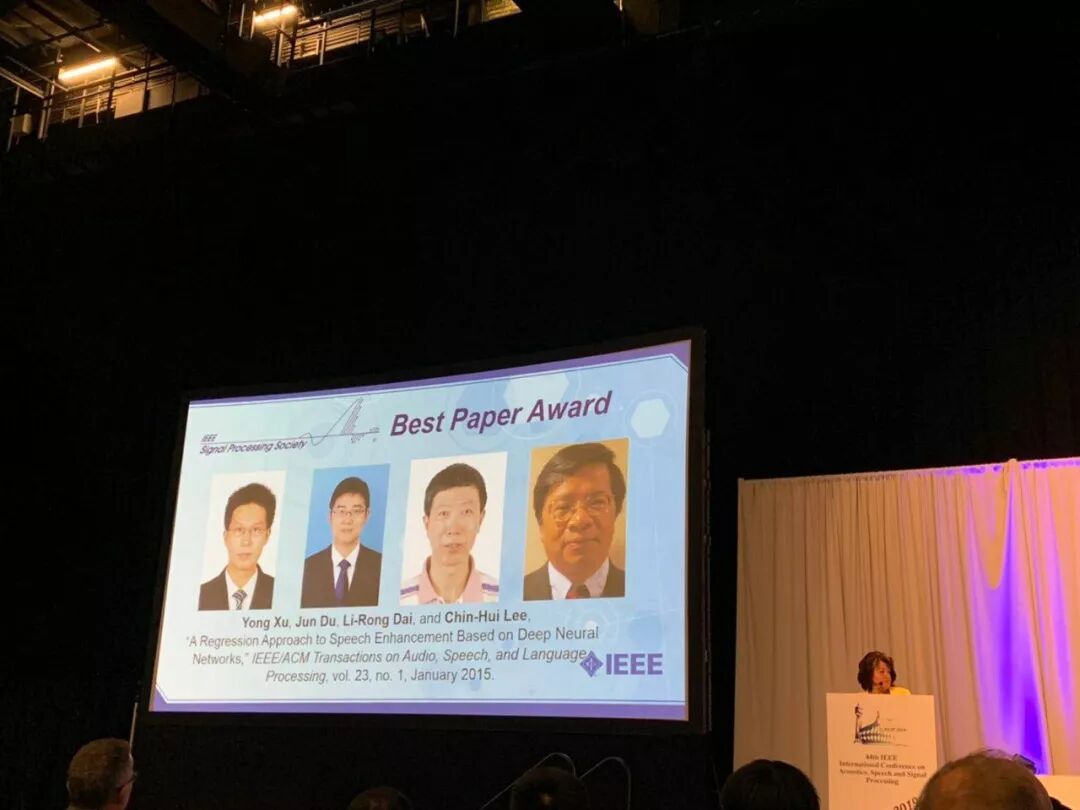 近日,在英国布莱顿举行的IEEE声学、语音及信号处理会议(ICASSP)上,中国科学技术大学语音及语言信息处理国家工程实验室智能语音团队,获得2018年IEEE信号处理学会最佳论文奖。