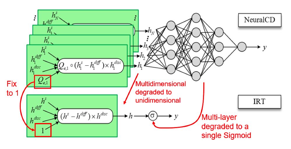 NeuralCD是泛化性较强的认知诊断框架,一些传统的认知诊断模型可被视为NeuralCD的特例(如矩阵分解、IRT、MIRT等)。例如,IRT与NeuralCD的关系可被下图5概括,