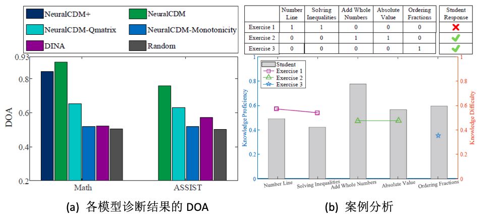 (a)(部分基准模型未做因为其学生向量没有与知识点的对应关系)。(b)是ASSIST数据集中一个学生诊断结果的实例。