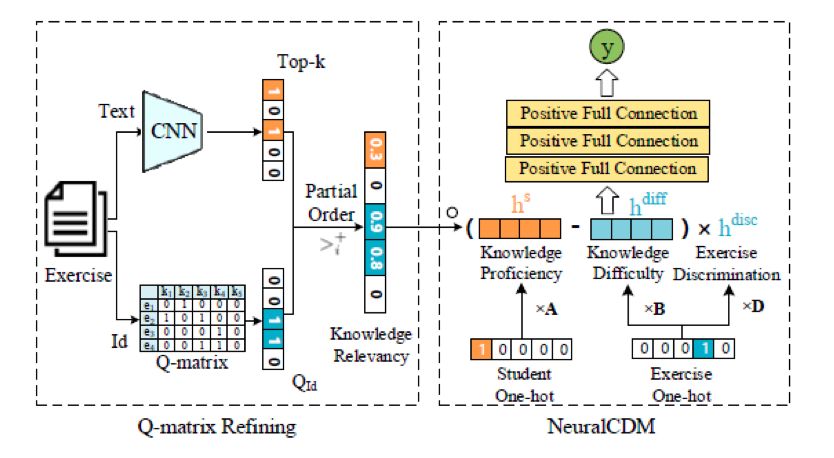 这是因为尽管人工标注的Q矩阵存在部分缺点,但仍然具有较高的可信度,因此Q矩阵中标注的知识点最有可能有较高的相关度。而既非标注也未被预测的知识点则认为是与该题无关。我们采用概率模型的方式来实现这一偏序关系,并最终得到经文本预测补充的知识点相关度矩阵 ,代替NeuralCDM中的