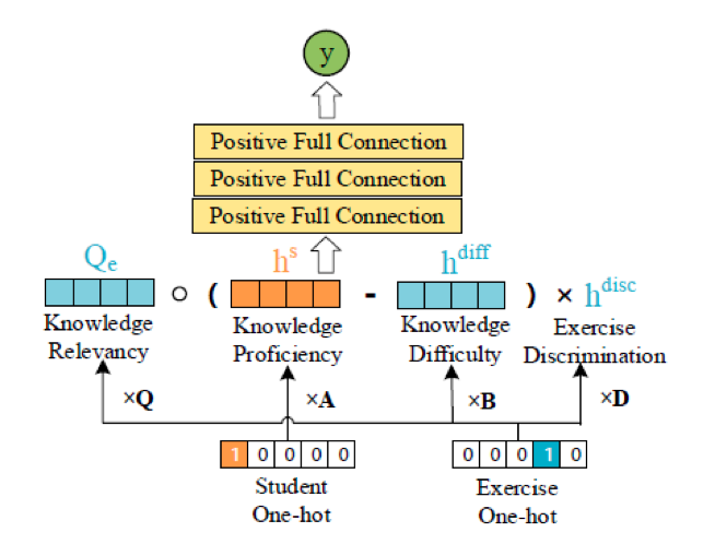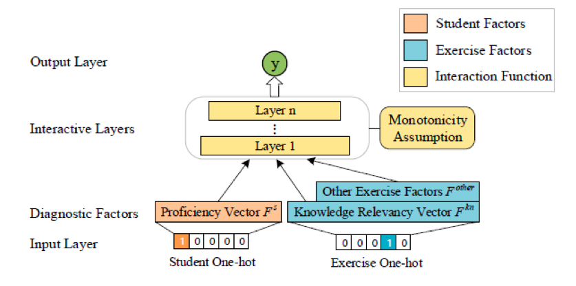 (如试题难度、区分度等)。交互函数则由多层神经网络构成,这是与传统方法最大的不同点。NeuralCD的输入为答题记录中学生和试题的one-hot向量,输出为学生答对该试题的预测概率。